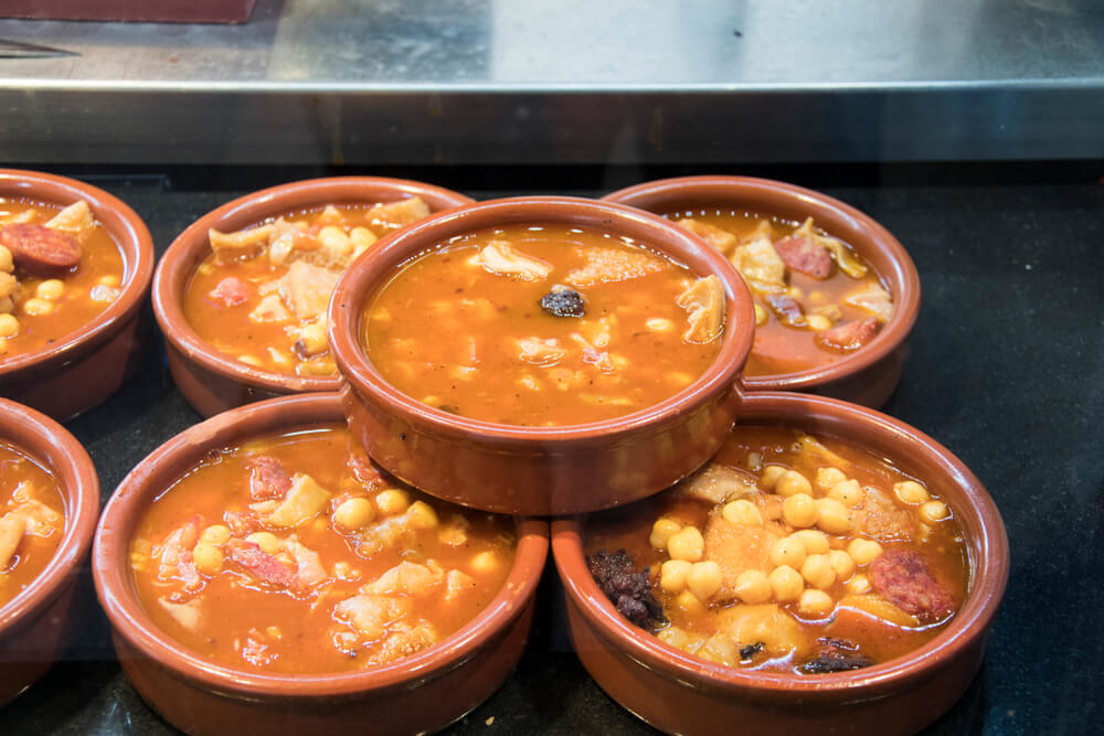 Folket i Madrid säger att man behöver en sked, gaffel och servett för att äta denna rätt. Detta eftersom det är en gryta som är full av ingredienser och protein.